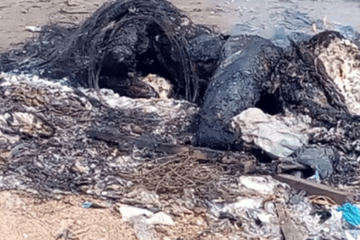 A suspected phone thief was apprehended and burnt to death by a mob at the Alaba Rago area along the Badagry expressway in Lagos this morning. See a graphic photo of the charred remains of the thief below: