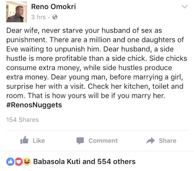 ‘Before marrying a girl, surprise her with..’ – Reno Omokri talks Sex & Side-chicks in new post