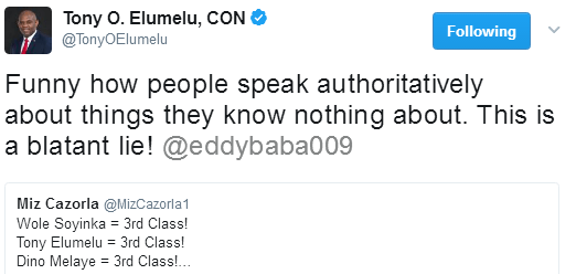 Billionaire Entrepreneur and Chairman of Heirs holdings, Tony Elumelu, yesterday refuted the claim by a twitter user that he graduated with a 3rd class.