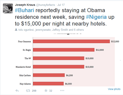 Joseph Kraus, who tweets regularly about issues affecting Africa shed more light on this cost saving effort when he did a cost comparison of how much Buhari would have spent if he stay at an hotel