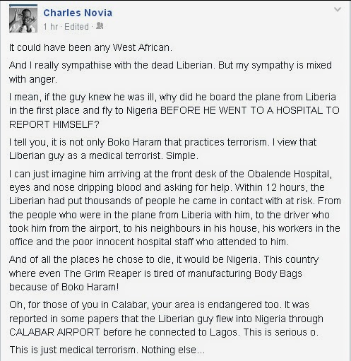CHARLES NOVIA ACCUSES DEAD LIBERIAN EBOLA VICTIM OF MEDICAL TERRORISM