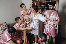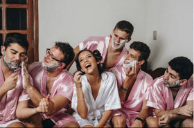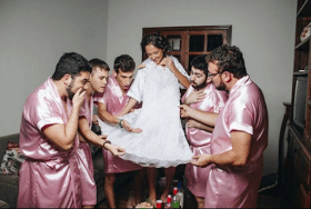 “I came up with the idea one week before the wedding. I was looking into some “making of” pictures of brides with their gang of girls, all in robes, laughing, drinking champagne and all, and I got a bit sad because I wouldn’t be able to do anything like that”. So she asked her male friends and they all agreed.