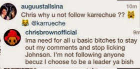 Yesterday Chris Brown posted a pic his and Karrueche Tran’s faces melded together on his instagram page and a fan asked him why he wasn’t following Karrueche. (Chris is not following anyone on instagram). Chris Brown’s response? Priceless! See it below: