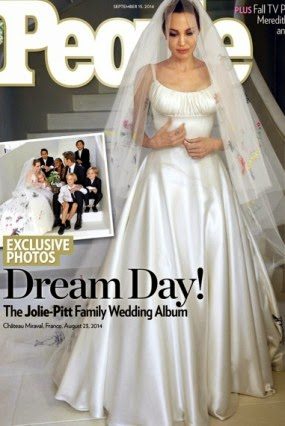 After nine years and six children together, Angelina Jolie and Brad Pitt finally said I do on August 23rd their French estate Chateau Mirava in front of small number of family and friends. Her wedding dress was created by Atelier Versace master tailor Luigi Massi with help from her kids in form of pictures displayed on the gown. And it looks like they sold the exclusive wedding photos to People and Hello magazine.