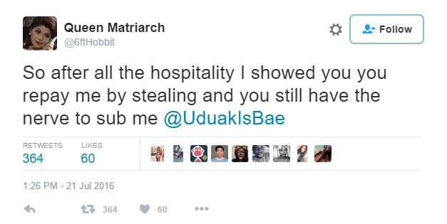 Madonna @6ftHobbit replied saying Uduak was just supposed to spend a night but ended up spending four days. That she stole things and ran away while her friends searched for them. When she attempted to message her in private, she blocked her and everyone who knew of her theft.