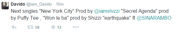 The singer, who recently performed at a sold-out concert in London wrote: ‘Next singles ‘New York City’ Prod by Shizzi, ‘Secret Agenda’ prod by Puffy Tee ,’Won le ba’ prod by Shizzi “earthquake” featuring SINA RAMBO.