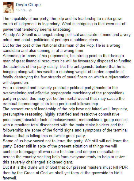 Former Spokesperson of former President Jonathan, Doyin Okupe, says the appointment of Ali Modu Sheriff as PDP Chairman is wrong and also coming at a wrong time.