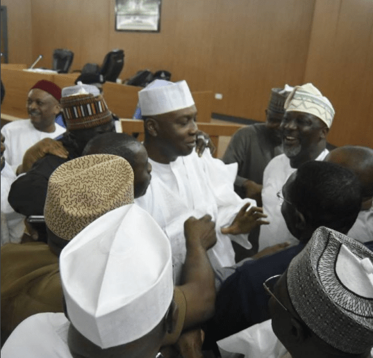 An overjoyous Dino Melaye lifted up his colleague and Senate President, Bukola Saraki, moments after the chairman of the Code of Conduct Tribunal CCT, Danladi Umar, discharged and acquitted him of all the 18-charges of false assets declaration leveled against him by the Federal government.