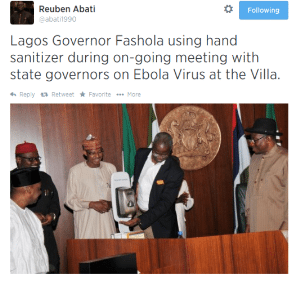 President Jonathan pictured above using hand sanitizer during on-going meeting on Ebola virus with state governors at the Villa. VP Sambo and Governor Fashola also used the sanitizer.