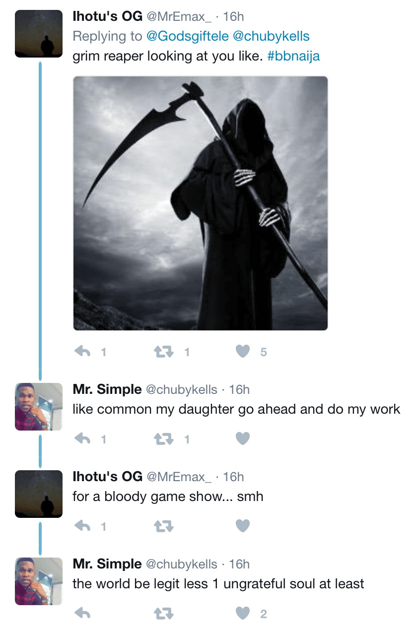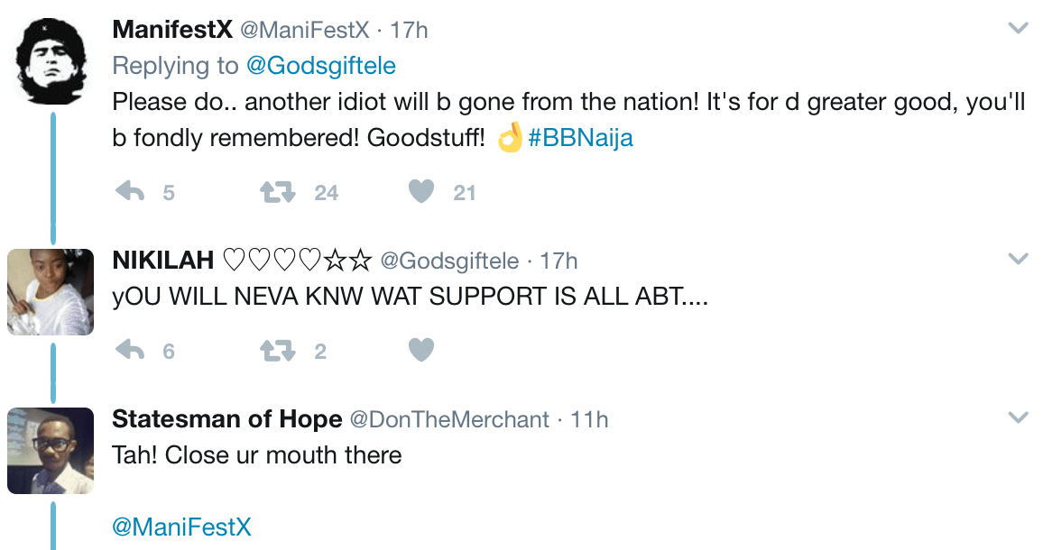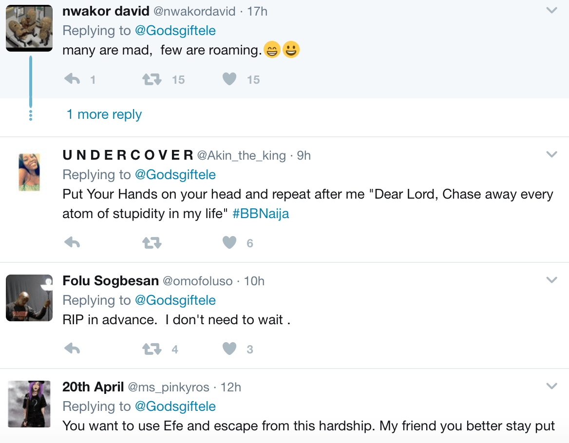 Nigerian Twitter user Nikilah @GodgiftEle declared on her page yesterday that she will commit suicide today if Big Brother Naija housemate Efe doesn’t win the reality show’s N25million prize money.