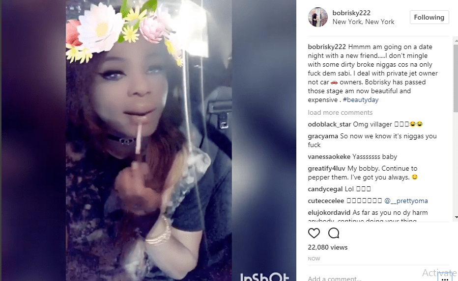“Hmmm am going on a date night with a new friend…..I don’t mingle with some dirty broke niggas cos na only fuck dem sabi. I deal with private jet owner not car owners. Bobrisky has passed those stage am now beautiful and expensive . #beautyday”