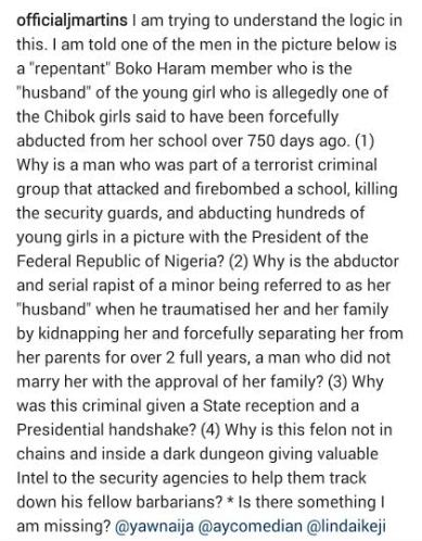 Singer J Martins took to Instagram early today, to share his thoughts on the rescued Chibok girl – Amina Ali’s visit to meet President Buhari. Apparently, J Martins was misinformed that a certain man who accompanied Amina Ali to the state house, was her ‘rapist/repentant Boko haram member’ and he ranted based on this, asking various questions.