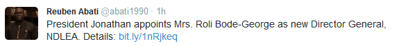 The Special Adviser on Media to President Goodluck Jonathan has announced the appointment of Mrs. Roli Bode-George as the new Director-General of the National Drug Law Enforcement Agency (NDLEA).