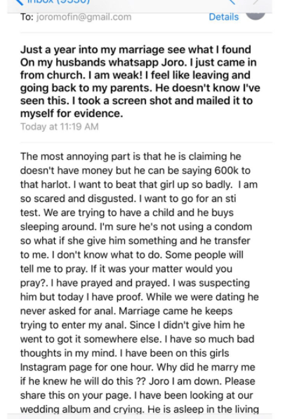 According to the lady, she has been married to her husband for one year. She snooped through her husband’s phone to find out he has a sidechick and engages in anal sex with the lady.