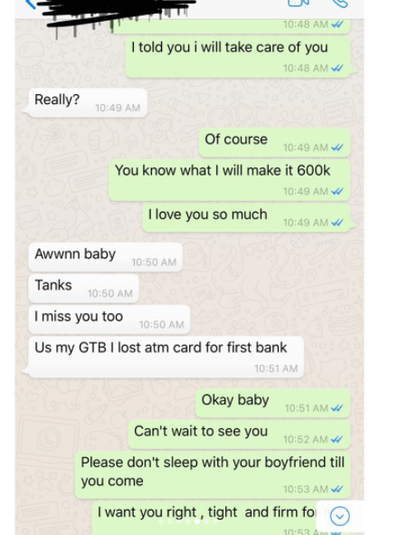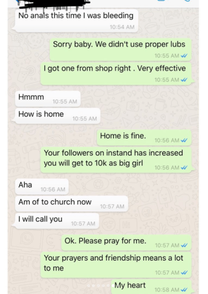 The chat she shared further revealed that the man promised to give the young girl N600 thousand naira and that she bled the last time she engaged in anal sex with him.