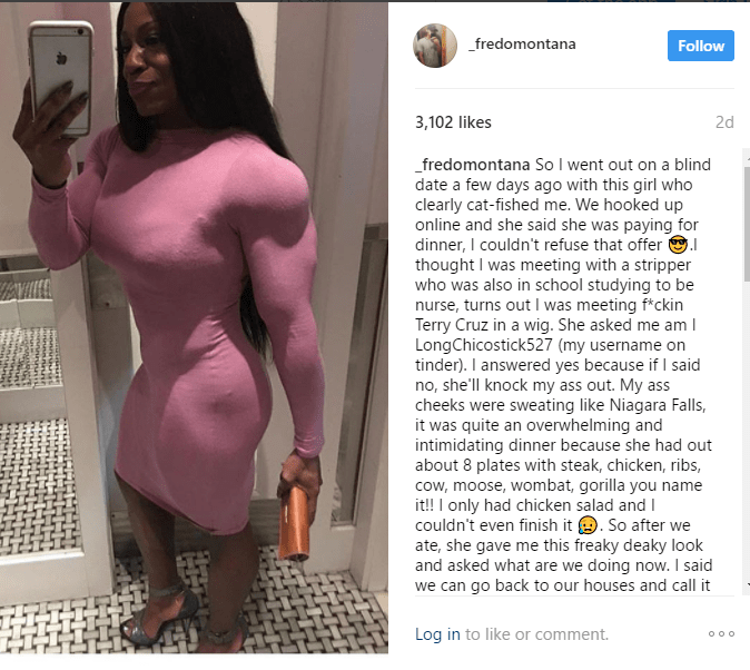 So I went out on a blind date a few days ago with this girl who clearly cat-fished me. We hooked up online and she said she was paying for dinner, I couldn’t refuse that offer ????.I thought I was meeting with a stripper who was also in school studying to be nurse, turns out I was meeting f*ckin Terry Cruz in a wig. She asked me am I LongChicostick527 (my username on tinder). I answered yes because if I said no, she’ll knock my ass out. My ass cheeks were sweating like Niagara Falls, it was quite an overwhelming and intimidating dinner because she had out about 8 plates with steak, chicken, ribs, cow, moose, wombat, gorilla you name it!!