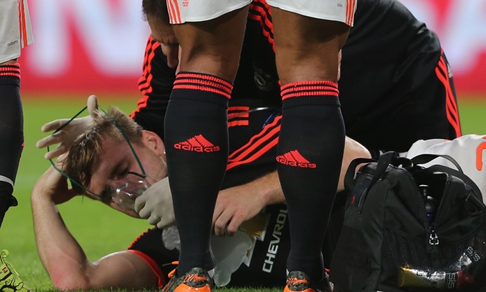 The defender broke his leg in the 15th minute of a champions league game against PSV Eindhoven.