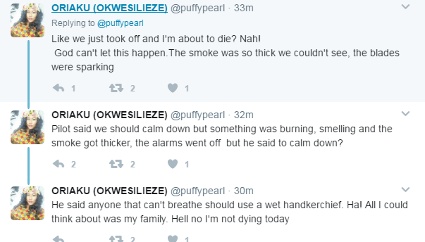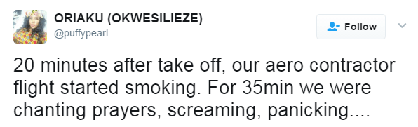 Twitter user, Oriaku recounted her experience today after the flight she was in almost went up in flames 20 minutes after departure.