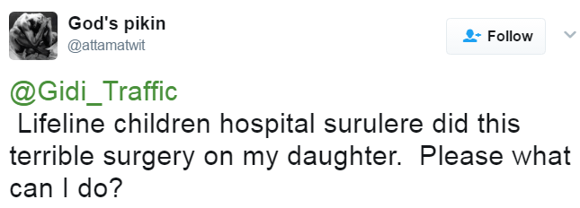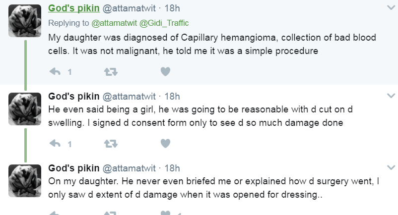 A Nigerian woman @attamatwit on twitter has cried out over a surgery carried out by a Nigerian doctor which left her daughter with a large facial scar.