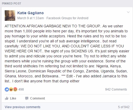 “ATTENTION AFRICAN GARBAGE NEW TO THE GROUP.. As we usher more than 1,000 people into here per day, it’s important for you animals to pay homage to your white acceptors. Heed the rules and try not to be too stupid. I understand you’re all of sub average intelligence.. but read carefully: WE DO NOT LIKE YOU, AND COULDN’T CARE LESS IF YOU WERE HERE OR NOT.. the sight of you SICKENS US.