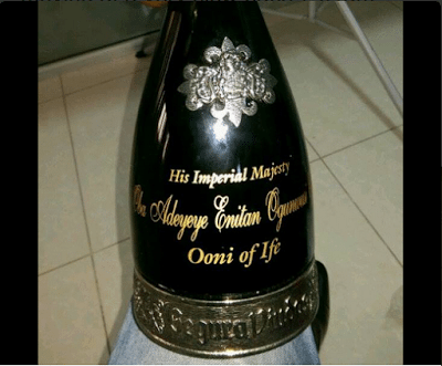 A bottle of wine customized for the new Ooni of Ile Ife, Oba Enitan Ogunwusi, following his recent status…Prince Adeyeye Enitan Ogunwusi of the Giesi ruling house emerged the 51st Ooni of Ile-Ife after the death of Oba Sijuwade …….He is to be installed as the Osun monarch in coming weeks….