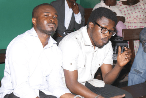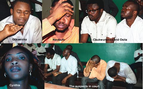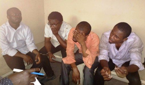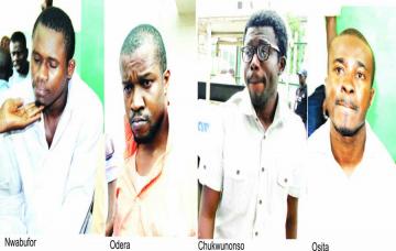 L-R:Orji Osita; Nwadiokor Chukwunonso, Suspected pharmacists; Okwumo Echezona Nwabufo and Ezike ilechukwu Olisaeloka, Suspected murderers of Late Miss Cynthia Osokogu at the Yaba magistrate Court, Lagos yesterday