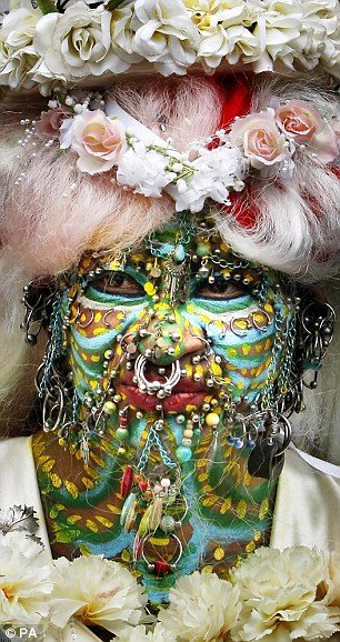 Crazy, weird or both? How does she manage to bathe or even sleep? To further accentuate her already weird looking piercings, Elaine adorns her self with outlandish wigs and outfits, and paints her face in brazen colors.
