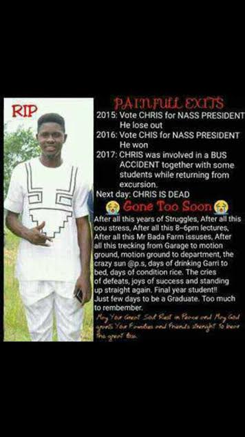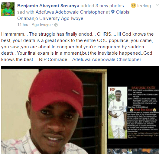 Few days to his graduation, the president of the National Association of Science Students (NASS), Olabisi Onabanjo University, Comrade Adefuwa Christopher, died in a fatal accident along Ile-Ife road, Osun State yesterday May 28th.