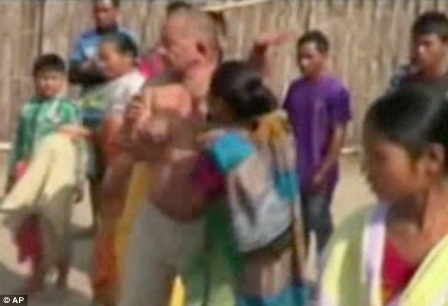 Several women are then seen tearing the politician’s shirt off and slapping him and a villager sprays graffiti on his government vehicle.