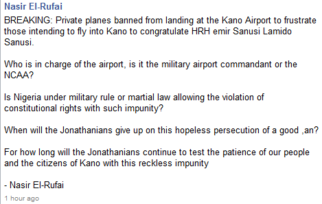 Mallam Nasir El-Rufai, is alleging the the Federal Government has banned private planes from landing at the Kano Airport to frustrate those intending to fly into Kano to congratulate the new Emir, Sanusi Lamido Sanusi.