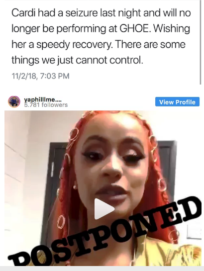 Cardi’s team has not yet to give a specifics about the illness that Cardi is suffering. Here are the posts from the event promoters: The first one was deleted quickly after being posted.