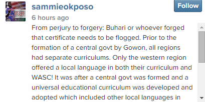He took to his Instagram, Facebook and Twitter page to show support for President Goodluck Jonathan, stressing that Buhari should be flogged for “forging his certificates.”