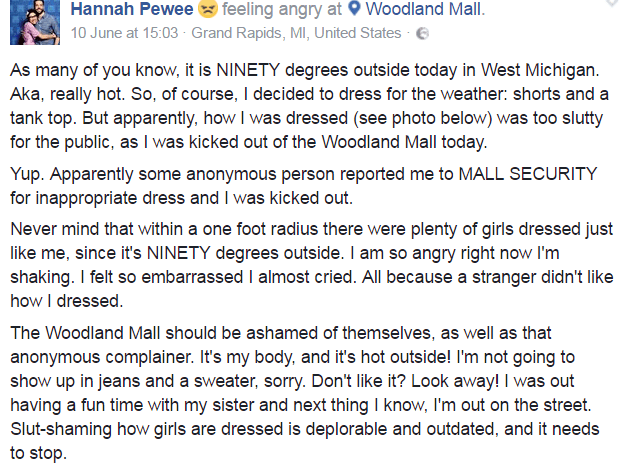 “As many of you know, it is NINETY degrees outside today in West Michigan. Aka, really hot. So, of course, I decided to dress for the weather: shorts and a tank top. But apparently, how I was dressed (see photo below) was too slutty for the public, as I was kicked out of the Woodland Mall today.