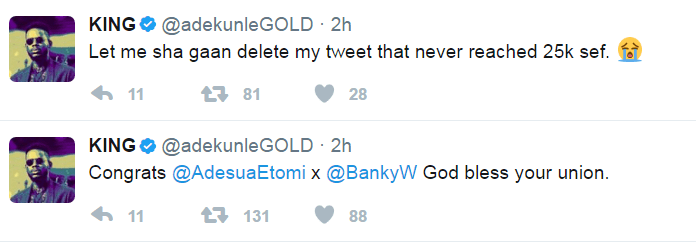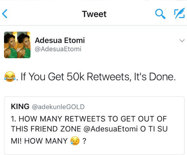 So, in October last year, actress, Adesua Etomi gave singer Adekunle Gold a task to get 50k retweets so he could get out of her friend zone.