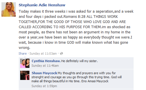 Writing on her Facebook account (Stephanie Adie Henshaw), which appeared to have been opened a few days after the separation, she indicated that the separation was not her initiative.