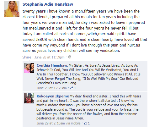 “Twenty years I have known a man, 15 years we have been the closest friends. I prepared all his meals for 10 years, including the four years we were married. The day I was asked to leave I prepared his meal, served it and I left. For the four years he never fell ill but today I am called all sorts of names -’ ‘witch’, and ‘mermaid spirit.’ I have served Jesus with clean hands and a clean heart. I have loved all that have come my way and if I do not live through this pain and hurt as sure as Jesus lives my children will see my vindication.”