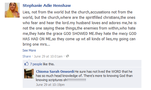 Speaking through various other posts, an obviously aggrieved Henshaw, also gave hints that she was implicated and falsely accused by ‘certain church members’.