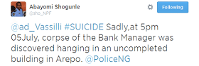 The body of Habib Olatunde (pictured above), a bank manager of an undisclosed Nigerian bank, has been found two weeks and six days after he was declared missing by the police. Late Mr Olatunde’s body was found hanging in an uncompleted building at Arepo in Ogun state on Saturday July 5th around 5pm. Abayomi Shogunle, the Deputy Force PRO, Nigeria Police Force, revealed this.