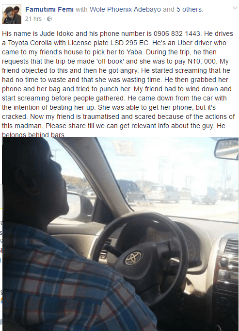 Facebook user,claims the Lagos Uber Driver pictured below,assaulted his friend because she refused to book off record.That infuriated him and he destroyed her phone.
