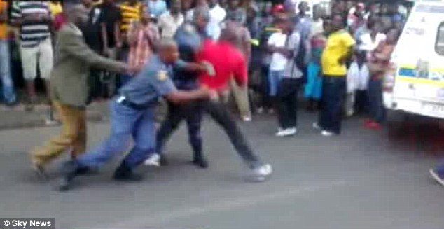 The video, which first appeared on South Africa’s Daily Sun website, shows officers overpowering their victim and knocking him to the ground.